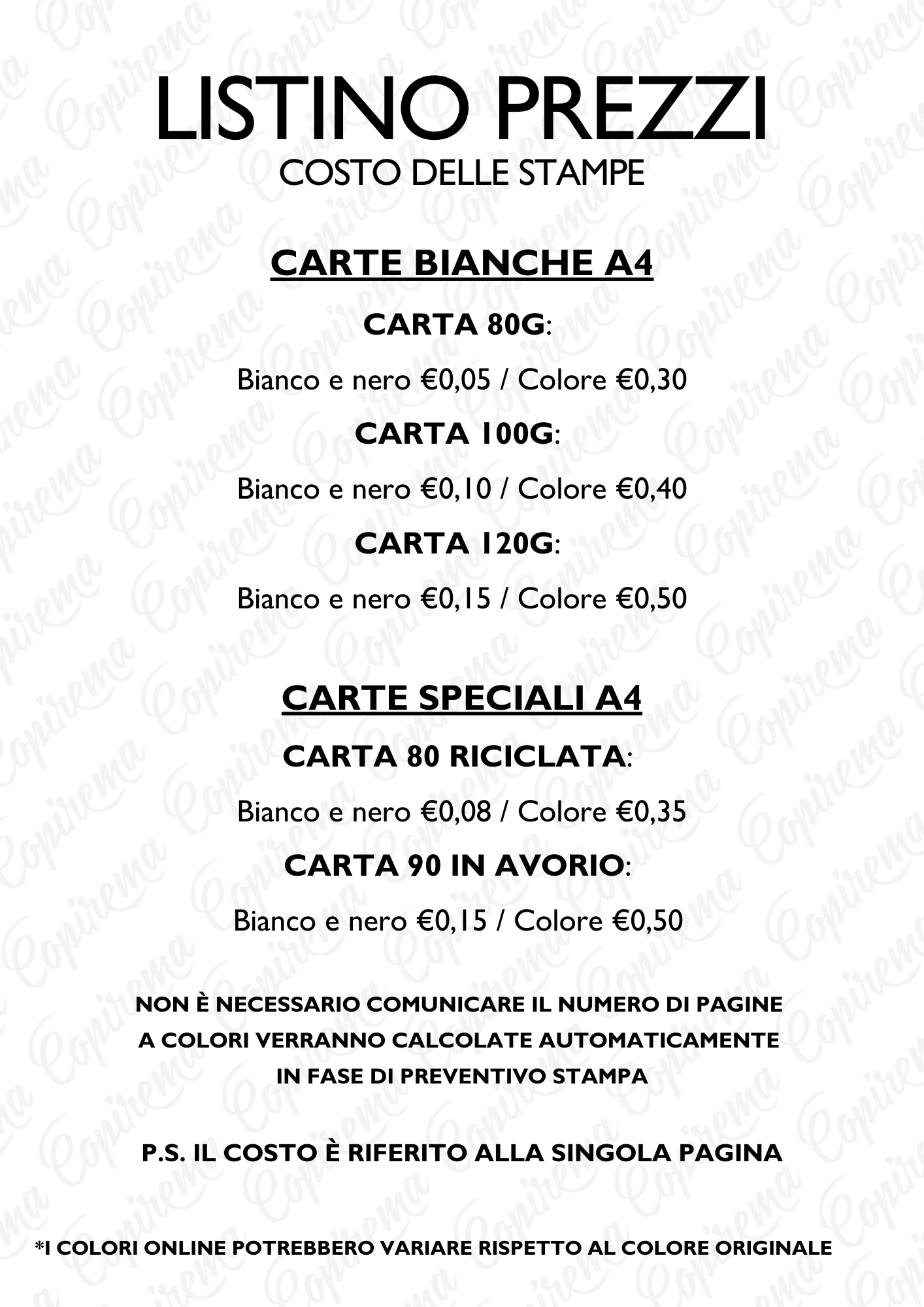 FRONTE/RETRO O SOLO FRONTE - TIPOLOGIA DI CARTA: 80g, 100g, 120g, 80g riciclata, 90g avorio.