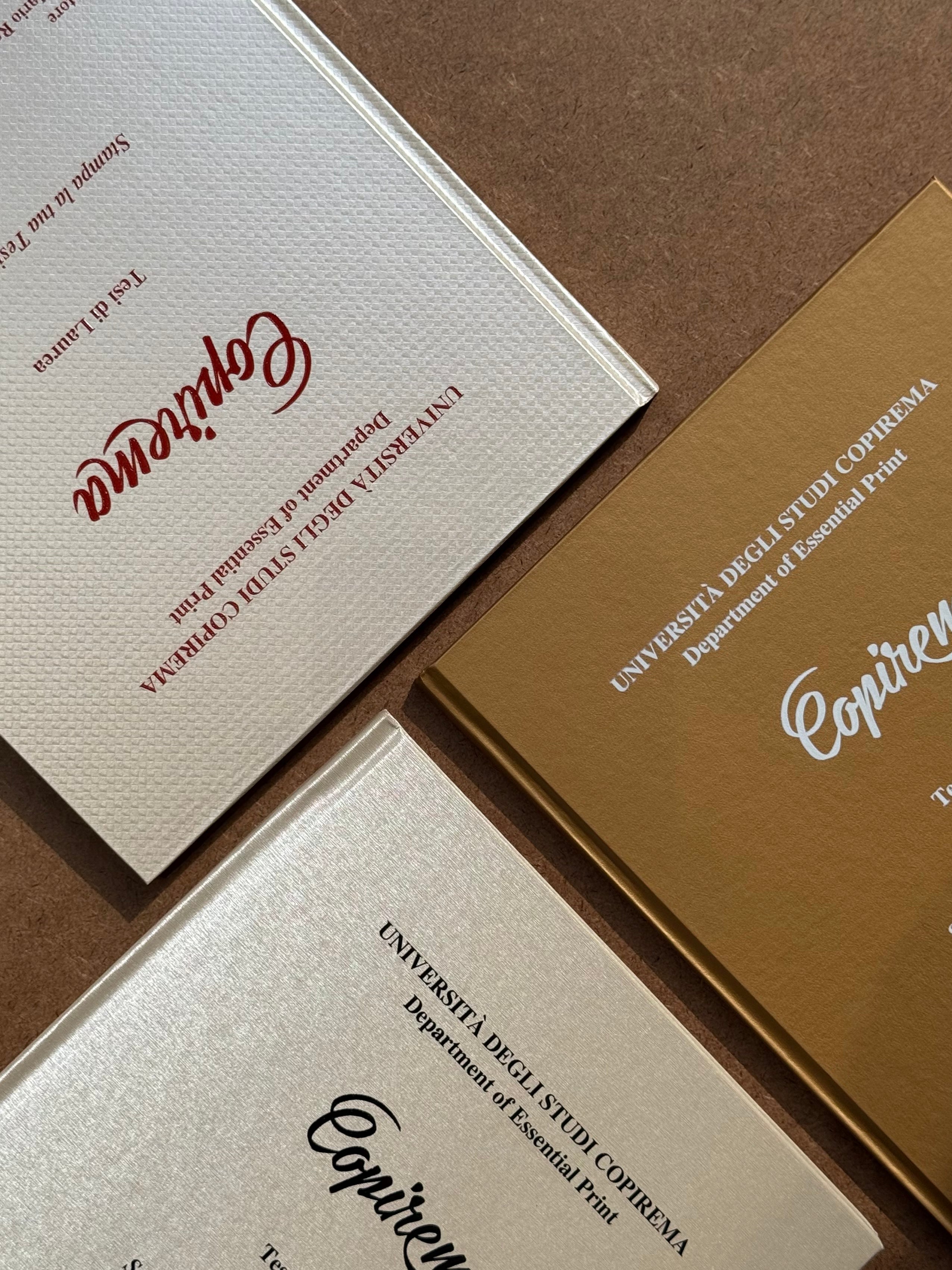 Dopo aver acquistato la copertina, invia la tua tesi via email a info@copirema.it per completare l'ordine, seguendo lo STEP 2.